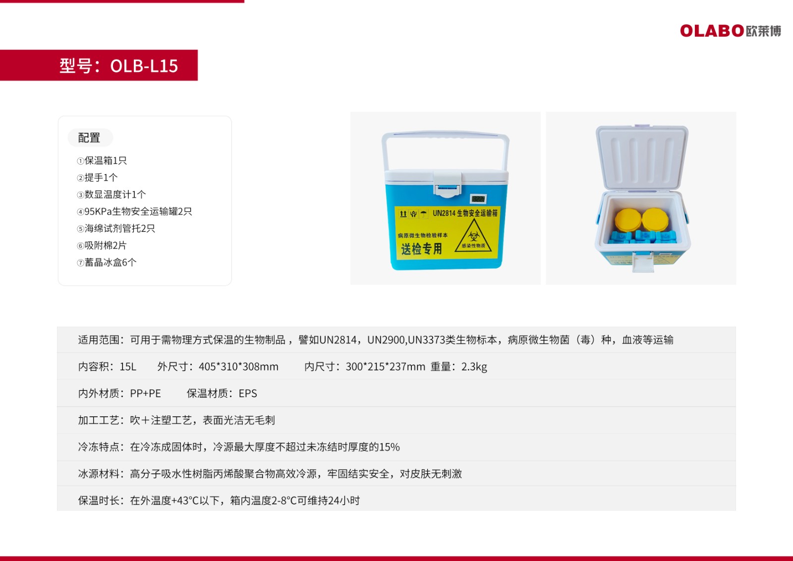 產(chǎn)品配置 | 保溫箱1只 提手1個(gè) 數(shù)顯溫度計(jì)1個(gè) 95KPa生物安全運(yùn)輸罐2只, 海綿試劑管托2只 吸附棉2片 蓄晶冰盒6個(gè) | 保溫箱1只 背帶1條 數(shù)顯溫度計(jì)1個(gè) 95KPa生物安全運(yùn)輸罐4只 海綿試劑管托4只 吸附棉4片 蓄晶冰盒9個(gè) 隔板1個(gè) 托盤(pán)1個(gè) | 保溫箱1只 數(shù)顯溫度計(jì)1個(gè) 95KPa生物安全運(yùn)輸罐5只, 海綿試劑管托5只 吸附棉5片 蓄晶冰盒11個(gè) | 保溫箱1只 數(shù)顯溫度計(jì)1個(gè) 95KPa生物安全運(yùn)輸罐8只, 海綿試劑管托8只 吸附棉8片 蓄晶冰盒11個(gè) | 保溫箱1只 數(shù)顯溫度計(jì)1個(gè) 95KPa生物安全運(yùn)輸罐20只, 海綿試劑管托20只 吸附棉20片 蓄晶冰盒15個(gè) |